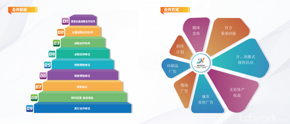 江苏省第二十一届运动会赞助企业设定为9个层级,分别是:首席全面战略合作伙伴、全面战略合作伙伴、战略合作伙伴、全程支持单位、特别赞助单位、荣誉赞助单位、赞助单位、特许经营/指定用品、其它合作单位,赞助企业根据不同层级可享有不同的权益回报。